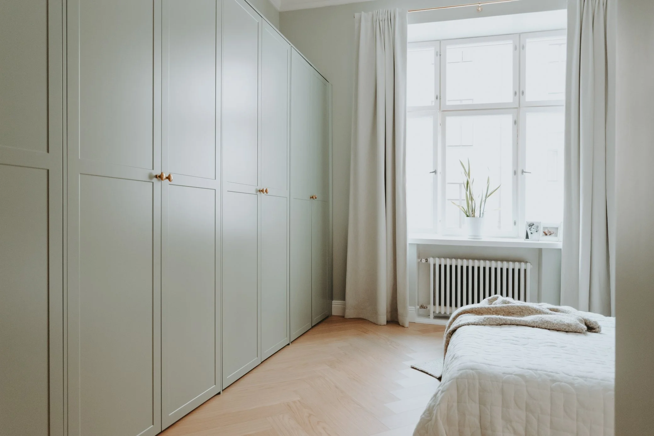 Asunnon värimaailma vaihtuu huoneesta toiseen, mutta soljuu kauniisti yhteen läpi koko huoneiston. Sävyt on vaaleita, kauniisti valoa taittavia ja harmonisia. Kontrastia tuovat musta ja valkoinen. Kullan- ja messingin väreillä on saatu ripaus luksusta kotiin.