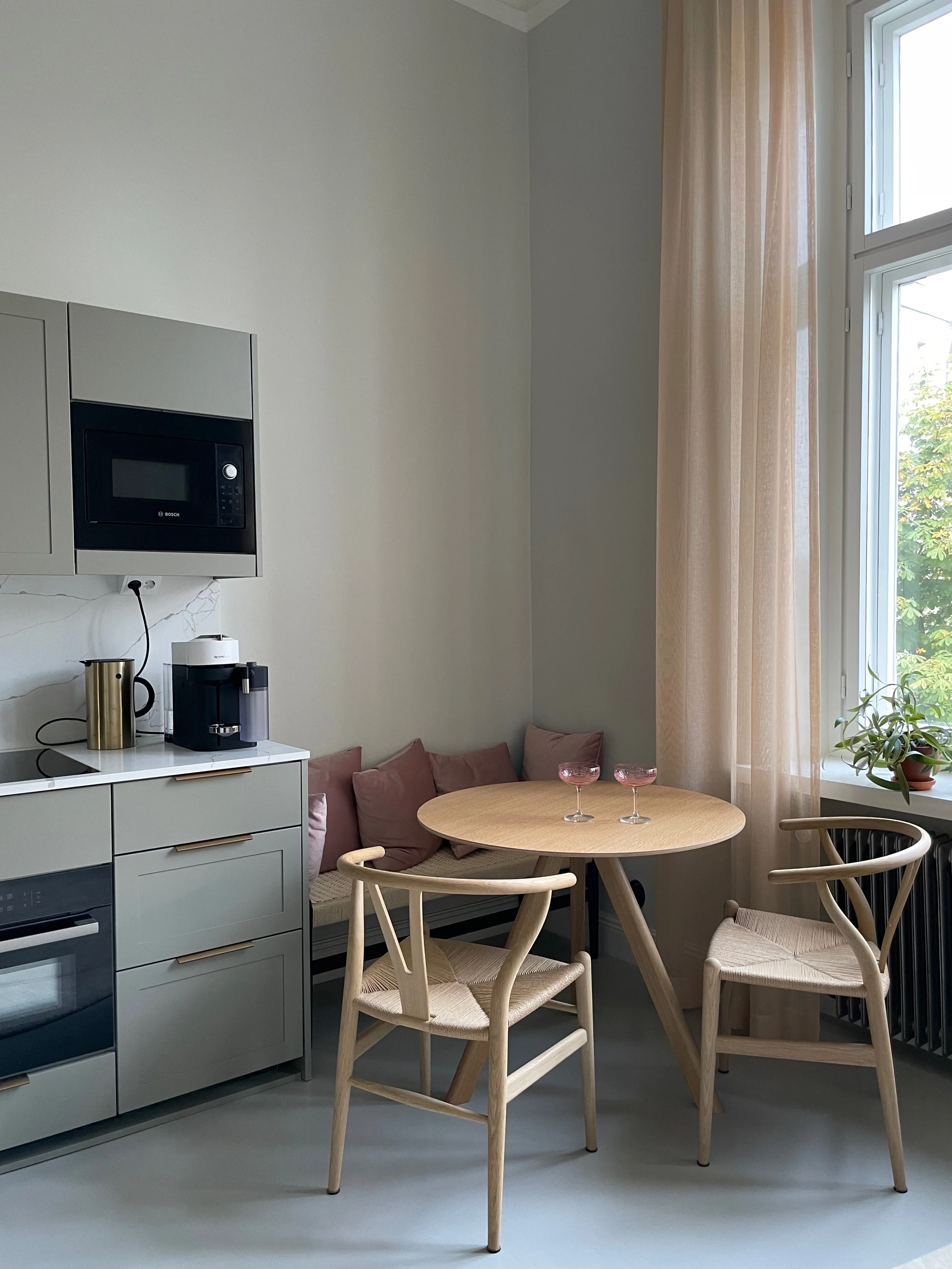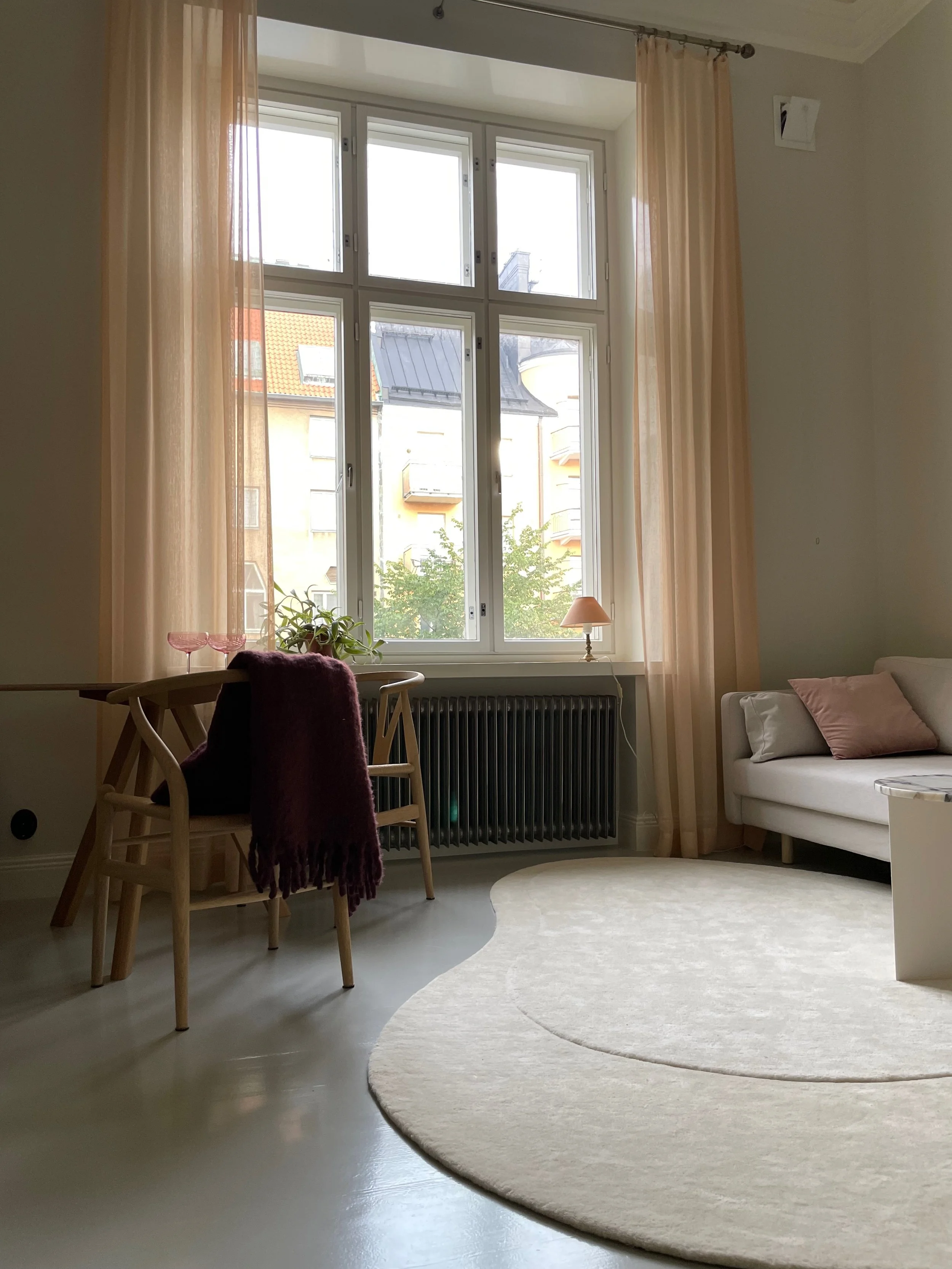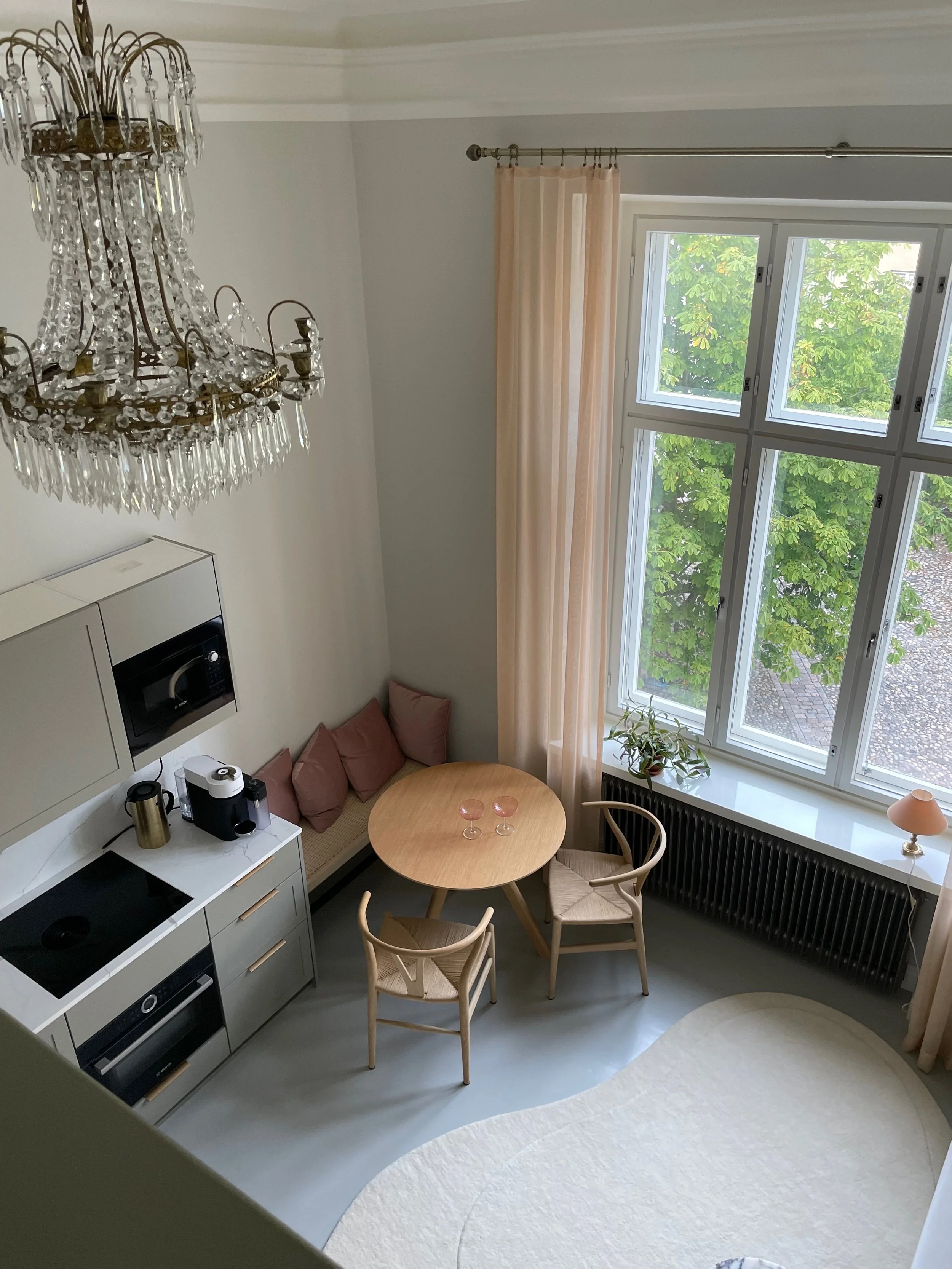 Kauniisti saneerattu yksiö Kruununhaassa sai tilaan ja tunnelmaan sopivat kalusteet. Kakkoskotina toimiva asunto on yllättävän tilava suuren huonekorkeuden vuoksi. Parvella on leveä nukkumatila ja alhaalla vielä vuodesohva vieraita varten. Ruokailuryhmä sain oman kulman, jota maton kauniit linjat mukailevat ja antavat tilaa toimia. Materiaalit ovat harkiten valittuja luonnonmateriaaleja ja värimaailma harmoninen.